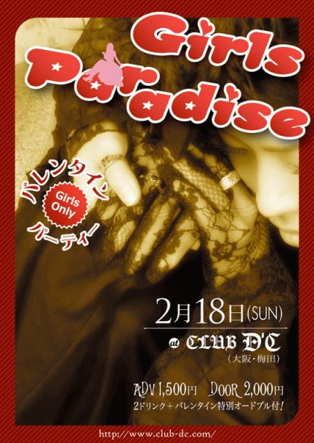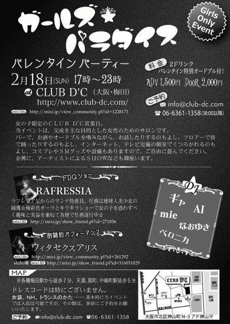 2月18日(日)ガールズ★パラダイス バレンタインパーティ at CLUB D’C(大阪・梅田) ※各種梅田駅から徒歩7分、天満、扇町、中崎町駅徒歩5分 http://www.club-dc.com OPEN 17時 CLOSE 23時 ADV 1500円 DOOR 2000円 (2ドリンク+バレンタイン特別オードブル付き!) 【DJ】 ギャ AI Mie ベロニカ なおゆき 【SHOW】 RAFRESSIA〔FDQ SHOW〕 ウィタセクスアリス〔倒錯的パフォーマンス〕 more… 女の子限定のCLUB D’C