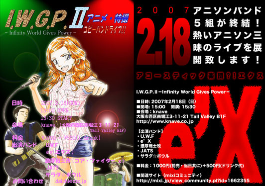 I.W.G.P.?−Infinity World Gives Power− ■日時: 2007年2月18日(日) ■開場: 15:00 開演: 15:30 ■会場:knave 大阪市西区南堀江3-11-21 Tall Valley B1F http://www.knave.co.jp 【出演バンド】 ・U.W.F ・e’X ・濃厚戦士改 ・JATS ・サラダ☆ボウル (出演順) ■料金:1000円(前売・当日共に)+500円(ドリンク代) このライブに参加するという方! そして、これから参加しようかなと思ってくださってる方! チケットも絶賛発売中です! 詳細はメンバーまでよろしくおねがいします