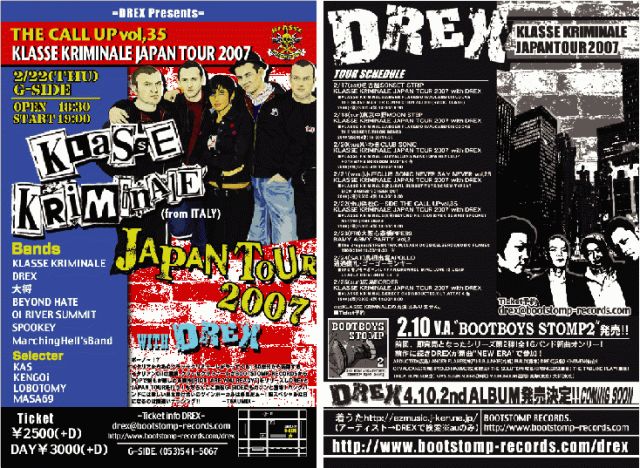 2/22 (thu) 浜松G−SIDE THE CALL UPvol,35 [ KLASSE KRIMINALE JAPAN TOUR 2007 with DREX] ◆KLASSE KRIMINALE ◆大将 ◆BEYOND HATE ◆OI RIVER SUMMIT ◆SPOOKEY ◆MarchingHell'sBand 2500(d別)/3000(d別) 18:30/19:00