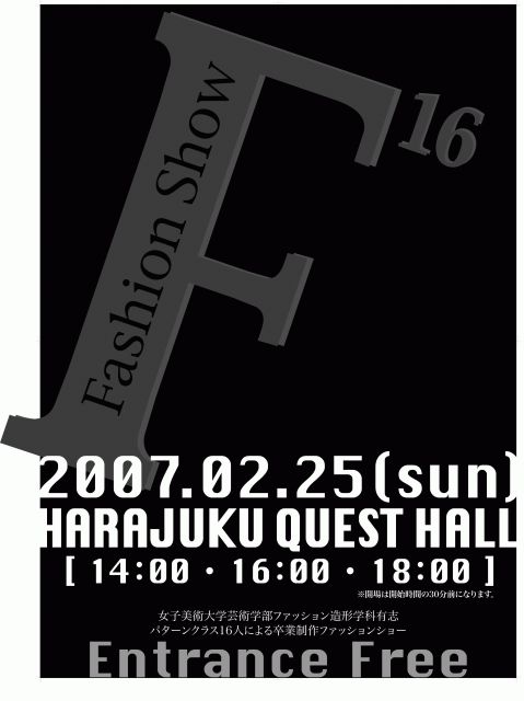 初めまして。告知失礼します。 女子美術大学ファション造形学科有志の卒業制作ファッションショーを行います。 私達は身体やそれを取り巻く空間のなかで総合芸術としてファッションを捉え、社会や文化などを含め、幅広い視点から学んできました。 多くの方々に見て頂きたいので是非起こし下さい。 2月25日(日) 原宿クエストホール 入場無料 時間:14:00 16:00 18:00 *開場は30分前になります。3回とも同じ内容です。 質問等ありましたらメッセください。