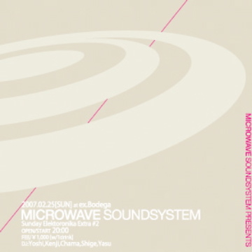 またまた新企画!始動です! 2007/2/25(sun) SUNDAY ELEKTRONIKA EXTRA ♯02 "MICROWAVE SOUNDSYSTEM" OPEN/START:20:00 @ex.Bodega FEE:1000[w/1D] Genre : Electro/Tech/ Breakbeats/Dubsteps □DJ□ Yoshi,Kenji,Chama,Shige,Yasy 各シーンで活躍するMICROWAVE DJクルーの膨大な音源コレクションよりセレクトするのは横浜ex.Bodegaのためのチャプター1。 いつものMICROWAVEとは違うアプローチで見せる実験的な空間は日曜日の新しい遊び場になるでしょう! cafe ex.Bodega 横浜市中区福富町仲通4-15国際ビル