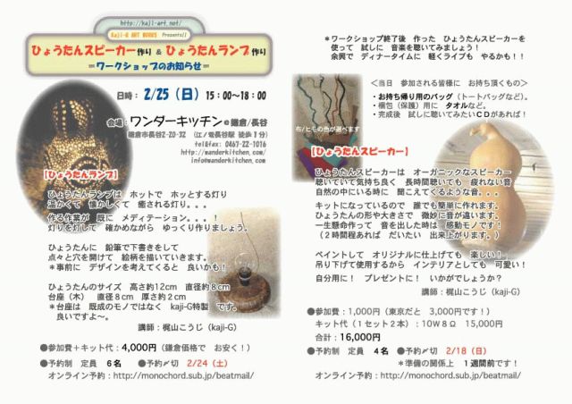 2/25(日)に 鎌倉(長谷)で ひょうたんランプ作り と ひょうたんスピーカー作り のワークショップを 行います。 会場は 古民家を改造した ゆったり出来る 鎌倉のカフェです。 『Wander Kitchen @ 鎌倉 長谷』 http://mixi.jp/view_community.pl?id=1839234 よろしかったら ぜひ ご参加ください! よろしくお願いいたします。。。 *詳しくは こちらをご覧下さい。 http://mixi.jp/view_event.pl?id=15294450&comment_count=0&comm_id=1839234