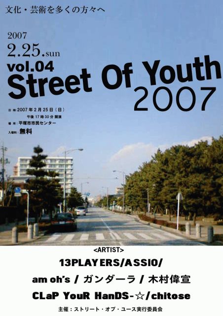 第4回になる平塚市で行われている。 ストリートオブユース2007!! 日 時:2007年2月25日 日曜日 17時30分 場 所:平塚市市民センター 入場料:無料 ◆ストリートアーティストが活動できる公共の場所を提供するため、ストリートアーティスト制度を神奈川県で初めて平塚市に導入するための運動。 この制度の理解を深めるとともに文化・芸術を多くの方々に 親しんで頂くため、平塚地域におけるアーティストの人的交流および情報交換を目的に展開しています。 前回平塚中央公民館では900名以上の来館で満員☆ 今回平塚