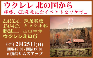 そうなんです、劇中の印象的な楽曲をウクレレでしっとりと、そしてちょっと明るく カバーしたCD「ウクレレ北の国から」がリリースです。そしてリリース記念パーティーも急遽開催大決定です。メインテーマを歌うLAULAを見られるチャンスです。 出演にLAULA!勿論テーマソングだけでなくLAULAオンステージもあるよ!、その他ゲストにはIWAO、キヨシ小林、勝誠二といったウクレレファンにはたまらない豪華ラインナップで、<フラガール>テーマソングを歌った照屋実穂も参加! 勿論この日も特別にジェークのではなくIWAOさんのウクレレ演奏