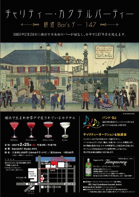1860年2月24日、横浜市中区山下町70番地(現在レストランかおり)に横浜ホテルが竣工し、 その中にプール・バーが出来たのが日本のバーの発祥です。 今年で147周年を迎えるにあたり、2月25日(日)に「横浜Bar’sデー147」のチャリティーカクテルパーティーを開催致します。 入場料:\2,000.-(2ドリンク付き) 追加1ドリンクall\500.- 会場 :横浜BankART(神奈川県警本部隣) 時間 :午後16:00〜19:00 当日は横浜から世界に発信された4カクテルをはじめ、 横浜出身者による生演奏(70〜80年代)や抽選会など 盛り沢山のイベント