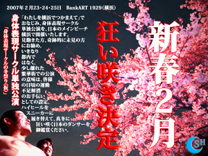 新春ワンマン公演 決定!! 2007年2月23・24・25日の3days、BankART 1929(横浜)にて単独公演「しんぱい少年」 あの鼻つまみ者グループが、土産も持たずに帰ってきた。 全国の「身体表現サークル」ファン、念願のワンマン公演を解禁いたします。 一発屋と言われはじめて4年目を記念し、簡単なダンスでオリンピック的な心意気を御披露予定。 会場は寒いです。(当日お酒が出るとか出ないとか) 準備運動として、少し酔っぱらって来場することをお勧めします。 だって、宴会芸だから。 ていうか、フンドシダンサーはもっと寒いから。