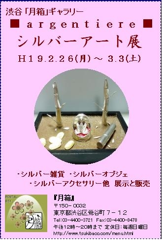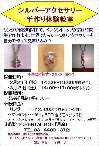 一番上の引き出しをお借りしている■ argentiere ■(アルジェンティエーレ)です。 2月26日(月)〜3月3日(土)まで「月箱」ギャラリースペースでシルバーの雑貨やオブジェ、アクセサリー等の展示販売を行います。 期間中、2月28日(水)と3月3日(土)の2日間、PM2:00からアートクレイシルバー(銀粘土)の体験教室を行います。 リングは2時間半、ペンダント他は1時間半で出来上がります。 ペンダントは小学生から体験できますのでお子様連れの方もお気軽にご参加下さい。 お申込お問い合わせは「月箱」まで・・・。