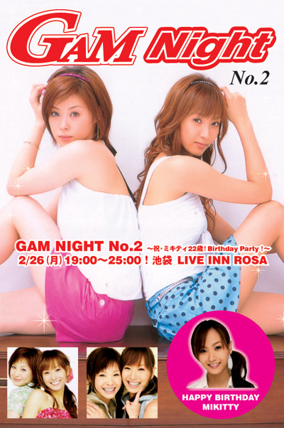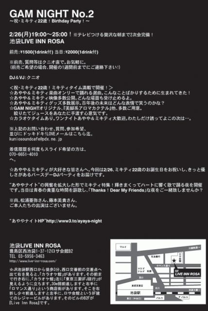 ミキティの22歳をお祝い致します! “GAM NIGHT No.2” 〜祝・ミキティ22歳!Birthday Party!〜 日時:2/26(月)19:00〜25:00! ※テレビつける贅沢な朝まで2次会完備! 会場:池袋LIVE INN ROSA 03-5956-3463 住所:豊島区西池袋1-37-12ロサ会館B2 http://www.live-inn-rosa.com/ ☆JR池袋駅西口駅前の大ハプニングから徒歩3分。 西口交番前の交差点へ出て右を見ると、 「カラオケ館」があります。その前まで行き右に、 「カラオケ館」左に、 「東京三菱UFJ銀行」が見えるように立ちます。 30m弱前進しますと右手に、 「ロマンス通