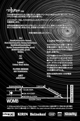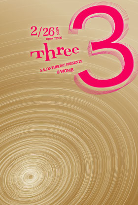 THREEとは、20代前半を中心にした人達に対して、音楽イベントをより身近な ものに感じさせ、クラブイベントの楽しみ方を知って頂くための場です。 メインフロアーでは、ハウスを中心としたポップでハッピーチューンなダンスミュー ジックを提供致します。 女性のお客様のためにラウンジをレディースフロアーにし、美味しいお酒を飲みなが ら、ゆっくり会話が楽しめるような、お洒落で心に残るラウンジミュージックを提供致します。 今宵の宴をお楽しみください。 -------------------------DJ------------------
