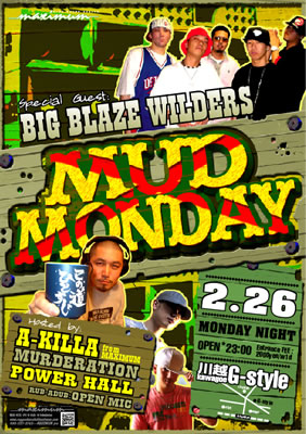 タイトル: MUD MONDAY 場所: 川越G-STYLE 住所: 埼玉県川越市菅原町20-3リンクスビル1F 開催日: 2007.2.26 [MON] 開演時間: OPEN 23:00 料金: ADM only: \3,000/w/1d 出演者: GUEST SOUND: BIG BLAZE WILDERS HOST SOUND: A-KILLA from MAXIMUM / MURDERATION / POWER HALL OPEN MIC: RUB-A-DUB 問合せ: 049-223-7170 OFFICIAL SITE: http://www.reggaedancehallmaximum.com ※第2回目のGUESTは去年の末に5周年を向かえ、 5th Aniversaryも大盛況&大好評だった、 ただ今、絶