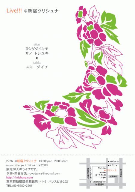 2月26日Live!!!@新宿クリシュナ ツインシタール X タブラ シタール ヨシダ ダイキチ サノ トシユキ タブラ スミ ダイチ 2/26 @新宿クリシュナ 19:30open 20:00start music charge + 1drink : ¥2500 限定30人のライブです。 予約・問合せ先:rovodance@hotmail.com http://krishuna.com 東京都新宿区歌舞伎町1-1-5 パレスビル202 TEL:03-5287-2561 出演者プロフ ヨシダダイキチ(シタール) 1996年よりインドにてシタール及びインド音楽理論を学んだ後、民俗楽器と現代音楽をテーマ