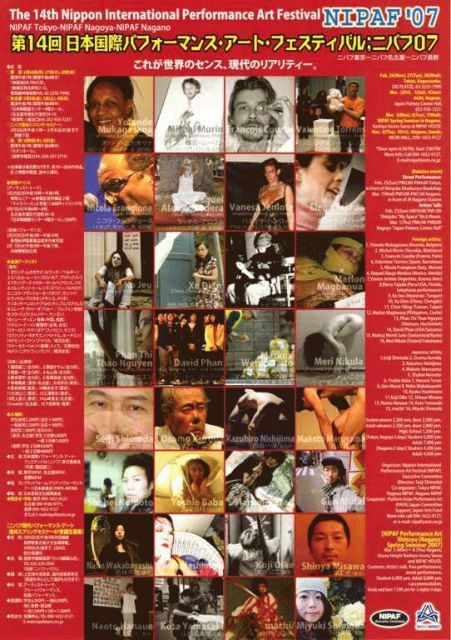 ■■■The 14th Nippon International Performance Art Festival '07 ■■第14回日本国際パフォーマンス・アート・フェスティバル'07 ■http://blogs.yahoo.co.jp/nagoya_nipaf/folder/930398.html これが世界のセンス、現代のリアリティー。 17カ国からアーティスト結集! NIPAFニパフ'07! ◆日程:東京-名古屋-長野 ◯東京:2月26日(月), 27日(火), 28日(水) 開演午後7時(開場午後6時半) 「神楽坂DIE PRATZE」 03-3235-7990 新宿区西五軒町2-12、東西線神楽坂駅4分 ◯