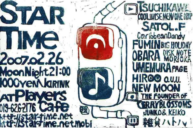 亥年生まれの方は当日new moonに声をかけてください。 先着18名様にポストカードプレゼントいたします。 ★STAR TIME★亥年SP@players cafe open21:00 1000yen(1D) http://playerscafe.jp ☆GUEST DJ 土川学(One Drop/Cool Wise Men) ☆DJ 藤井悟(Caribbean Dandy) FUMIN(BIG HOLIDAY) OBARA(DISK NOTE盛岡) UMEMURA(PAGE) HIROO(OUU) new moon ☆フロア 初代チェリーブラッサム(Junko&Keiko) ☆お店 雑貨ハトル ◎今月は東京発レゲエカルチャーブランド『One Drop』のオーナーで、クールワイズメンのギター担当ツチカワ氏をゲス