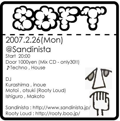 『SOFT』 @Sandinista 2007/2/26(Mon) Start 20:00 Door 1000yen (Mix CD - only30!!) ♪Techno , House , Jazz♪ ▼DJ Kurashima Inoue Motoi (Rooty Loud) otsuki (Rooty Loud) Ishiguro Makoto Sandinista : http://www.sandinista.jp/ Rooty Loud : http://rooty.boo.jp/ ご覧いただきありがとうございます。 2/26月曜日。 平日ならではの"soft"な音楽に包まれてください! 当日お越しいただいた先着30名様にはMix CDをプレゼントいたします! 何かわからないことなどありましたら、気軽にメッセージください。
