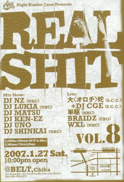 二ヶ月に一回、奇数月の第四土曜日に 千葉のCLUB BELTにてNHCプレゼンツ、 「REAL SHIT]があります。 千葉内外のアーティスト達が集まり、週末の夜を 熱く盛り上げています! 東京、埼玉、神奈川、茨城、千葉、 その他都道府県、その他国々の皆様にBIGUP! 出演者 LIVE: 大<オロチ>蛇(S.C.C), 単駆(NHC), BRAIZ(UBG), WXL(NHC) DJ: NZ(NHC), LUKIA(NHC), MATSU, KEN-EZ(B.P.F), UNO, SHINKAI(NHC) ADV:2000/1D BELT・・・ http://www.club-belt.com