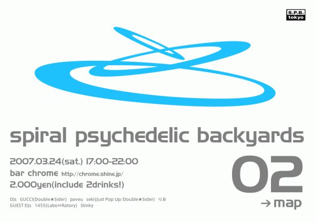 "Labo⇔Ratory", "telegenic", "SLN03", スパイラルDVD-BOX発売, エトセトラエトセトラ。 年明けからイベント目白押しのウィッツイヤー2007年。 "s.p.b."も乗り遅れるまじと、3月24日に"s.p.b. vol.2"を開催します! 『spiral psychedelic backyards vol.2』 [place] 三軒茶屋 chrome (http://chrome.shine.jp/) [date] 2007.3.24(sat.) [time] 17:00-22:00 [entrance fee] 2,000yen (include 2drinks! + can badge!!) 【mixi】 http://mixi.jp/view_community.pl?id=1310979 【website】 http://roo.to/spb http://