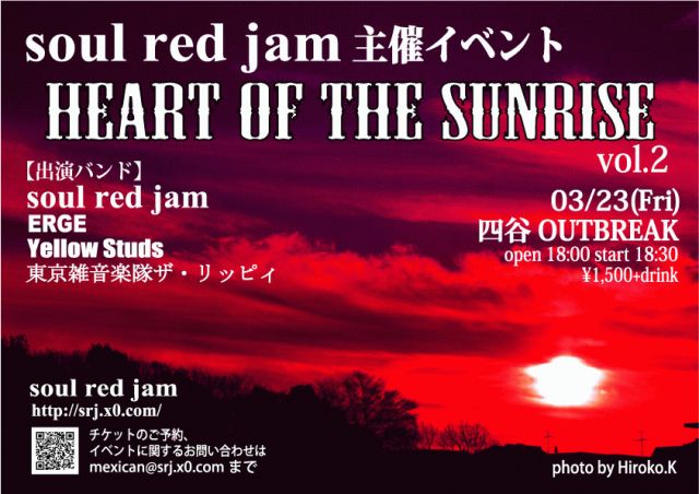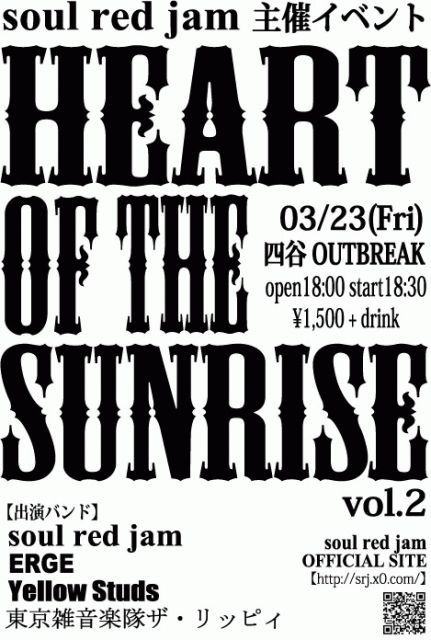 2007/03/23(金) 四谷OUTBREAK soul red jam 企画 【Heart of the Sunrise vol.2】&【レコ発】 SRJ初となる5曲入りミニアルバムを発表!! open18:00/start18:30 ¥1,500+drink 出演バンド:(順不同) 【soul red jam】 我らがノスタルジック・エモーショナル・ロックンロール!! http://srj.x0.com/ 【ERGE】 激しさと裏腹にそのメロディーは極上!騒やかロックンロール!! http://roo.to/erge/ 【Yellow Studs】 鍵盤ボーカルが吠える!セクシー・やさぐれロックンロール!! http://www.sound.jp/yellowstud