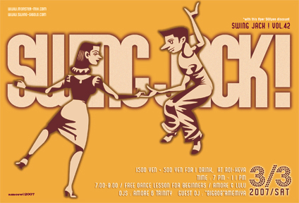 3/3(SAT) @青い部屋 http://www.asahi-net.or.jp/~nf3h-uen/mapbb.htm 1500YEN+500YEN(1 DRINK) TIME:7PM-11PM 7PM-8PPM / FREE DANCE LESSON FOR BEGINNERS WITH AMORE & LULU 8PM-11PM / DANCE TIME DJS:AMORE & TRINITY GUEST DJ : BIGBOB AMEMIYA 毎月第1土曜日に開催しているスイングジャックです。 スイングジャックはクラブイベントです。 お酒&ダンス&音楽を楽しみに来てください。 1920年代後半にハーレムで黒人達が踊っていた、 リンディーホップというダンスを楽しみます。 音楽もディキシーランドジ