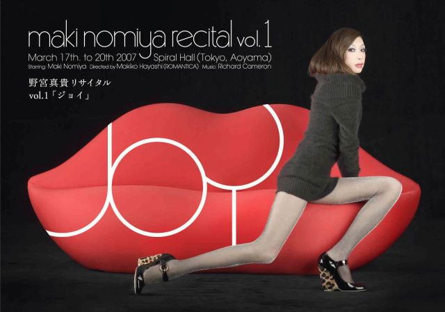 Supported by PEACH JOHN 野宮真貴リサイタル vol.1「ジョイ」 主演:野宮真貴 構成・演出・美術:林巻子(ロマンチカ) 音楽:リチャード・キャメロン 客演:菊地成孔 振付:横町慶子(ロマンチカ) JOYは、魔法の合言葉。 リサイタル……。 この言葉は、今やあまり目にしなくなりましたが、たとえば、かつての「越路吹雪リサイタル」の如く。ステージに、華やかな衣装をまとった歌姫が登場し、歌いまくるだけではなく、ミュージカル的な一幕や、ユーモアのあるちょっとした芝居や、小粋なお喋りや、素敵な踊りが添えられる。この世