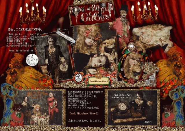 「3月 春爛漫! 不具の痩せぎす男の食卓に 魔法をひとつ、と やってきたけど あら、不思議 人間テーブルじゃぁございませんか? 今回も豪華絢爛 じとじとした 食卓シーンがご愛嬌の 薔薇は舞い散り お茶は溢れて 春らしく ダァクメルヒェン お持ちいたします!」 春だよ春だようかれて ■オムニバスCD発売記念イベントスペシャル!!■ 2007.3.24(Sat) Dark Marchen Show!!22 IN [Darkest Labyrinth vol.2 ] @東京 池袋サイバー OPEN15:30 / START16:30 前売\3,000/当日\3,500(1D別 ) ※ドレスコー