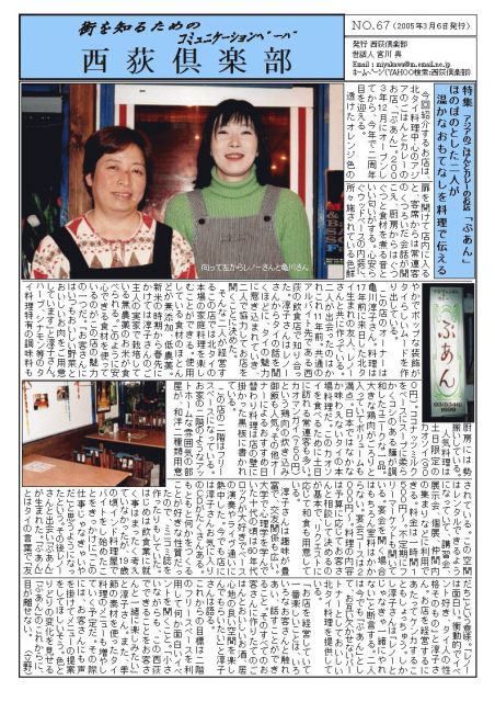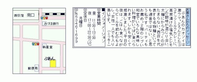 今回のテーマはズバリ!! 『飲み部だけどグルメに行きタイ』って事で! 西荻のタイと言われてるかわからないけどタイ料理の『ぷあん』で開催予定です! 第一回部活動に参加された方も新入部員の方もそこの君も みなさん気軽に遊びに来て下さい! 今回は31分早めて20時29分からスタート予定です♪ ■□■□■□■□■□■□■詳細■□■□■□■□■□■□■ 日時:2007年3月24日(土) pm20時29分〜 場所:ぷあん TEL:03-5346-1699 画像(左):見やすい地図 画像(右):お店の目印になる『ぷあん』と書いてある看
