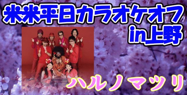 ついにやってまいりました皆様(一部の)! サービス業や主婦の方々で、平日休みでいつも土日中心に開催されていたオフ会に参加できなかった貴方(私も)に朗報です! 桜も咲かんとする春のうららの3月27日火曜日(仏壇の日( ̄▽ ̄;)に『米米平日カラオケオフin上野 ハルノマツリ編』を開催いたしたいと勝手に思っております! 基本、米米+石井竜也のカラオケでして、歌えや踊れや聴けやの大騒ぎですか? A.はいそうです。 200曲以上有る中から何を歌うかは貴方次第!! 歌うだけ、聴くだけ、踊るだけ、リクエストするだけ、ジュース飲むだ