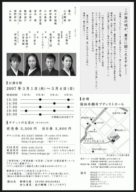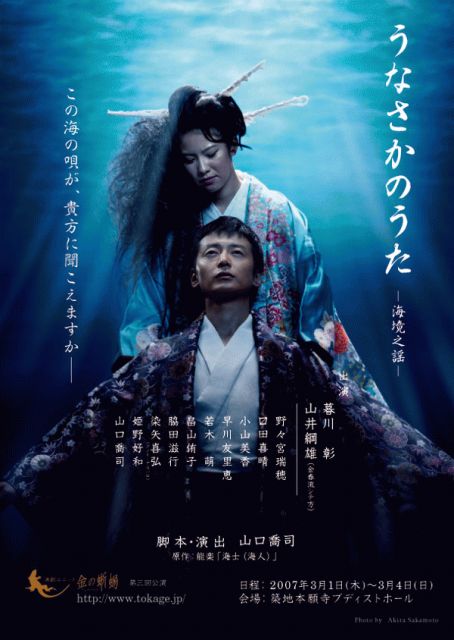 失礼いたします。公演の宣伝をさせてください。 ***************************************** ◆演劇ユニット金の蜥蜴・第3回公演◆ 「うなさかのうた―海境之謡―」 能楽と現代芝居の融合を追求する金の蜥蜴が、母と子の情愛を描いた能「海士(海人)」とアンデルセンの名作童話「人魚姫」を題材に、殺陣と笑いと涙をふんだんに散りばめてお送りする、新感覚伝奇時代劇第三弾! ■ストーリー 「海境〜うなさか」―― そこは海にあるという、神と人とが住む境。 今は昔、時の大臣・藤原房前は、幼少の頃に亡くした母の面
