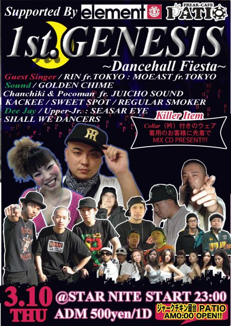 3/1(THU) @千葉STARNITE OPEN 23:00〜 〜Dancehall Fiesta〜 【1st.GENESIS】 -GUEST SINGER- RIN fr.TOKYO MOEAST fr.TOKYO -SOUND- GOLDEN CHIME CHANCHIKI/POCOMAN KACKEE SWEET SPOT REGULAR SMOKER -DeeJay- Upper-Jr. SEASER-EYE -SHALL WE DANCERS!!- -FOOD- ジャークチキン屋 PATIO ☆KILLER ITEM☆ COLLAR(衿)付きのウェア着用のお客様に先着でMIX CDプレゼント! ADM 500yen/1D 3/1の1st.GENESISは… ゲストシンガーにRIN from TOKYO、MOEAST from TOKYO が