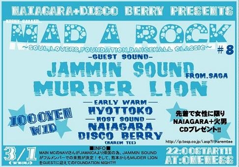 NAIAGARA&DISCO BERRY PRESENTS.. MAD A ROCK#8 OLDES NIGHT!! 〜SOUL,LOVERS,FOUNDATION,DANCEHALL CLASSIC!!〜 3月1日(木) 22:00 START!! @ONENESS DAY.1000YEN/W1D ※先着10名様位の女性のみ1000YEN/W1D/W2CD −GUEST SOUND− ★JAMMIN SOUND from 佐賀 ★MURDER LION −EARLY WARM− ☆火男 −HOST SOUND− ☆NAIAGARA ☆DISCO BERRY a.k.a HAREM TEE COMING SOON! MAIN MCのNAVIさんがJAMAICAより帰国の為、JAMMIN SOUNDがフルメンバ