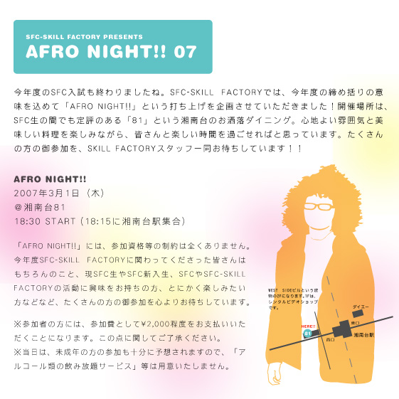 皆さん先日はSFC入試お疲れ様でした!SFC-SKILL FACTORYでは、今年度の締めくくりとして「AFRO NIGHT!!」という打ち上げを企画させていただきました! 「AFRO NIGHT!!」に関する詳細は、SFC-SKILL FACTORYサイト内の「Daily-SFC」をご覧ください。 それでは、たくさんの方のご参加をSKILL FACTORYスタッフ一同お待ちしています!!
