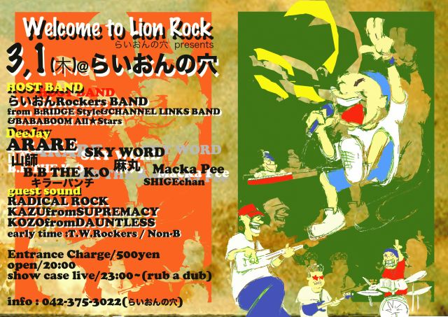 3/1[THU] @多摩らいおんの穴BAR http://club.ilipoo.com/lion-no-ana/index.html [[[WELCOME TO LION ROCK!!]]] OPEN/20:00〜 LIVE/23:00〜 LIVE> ARARE/山師/BBtheKO/MACKA PEE/SKYWORD/麻丸/キラパンチ/SHIGEchan/and more ...open mic!!!! with らいおんROCKERS BAND(BABABOOM ALL☆STARS+CHANNEL LINKS) SOUND>RADICAL ROCK/KAZU from supremacy/KOZO from dauntless/T.W.ROCKERS/NON-B