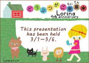 ご無沙汰しております、taeco*です。 ことし、初の企画展に参加します。 お世話になっている下北沢のLorinaの4周年をお祝いする企画展 『どうぶつがご来展』 作家さんがそれぞれどうぶつをテーマに作品をつくる。 というそのままの企画です。 正直、まだ出来てないんですがぁ、、、 参加しまぁーす!!!がんばりまーす!!!! 見にきてください☆ Lorinaでは5月に個展をする予定なので、 そのときはモリモリ作品だします。 よろしくお願いします♪ http://www.lorina.co.jp/