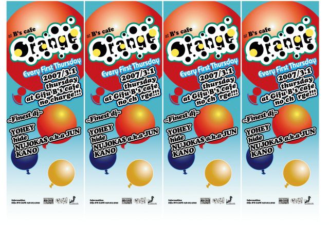 ◆Orange 2007.3.1(thu) @岐阜B's Cafe:058-263-3692 start 9pm〜mid no charge★ ‐DJ's‐ YOHEY、hide、NUJOKAS、kano、FUJIYOSHI ※もうすぐOrangeも4周年っす!! 今回もよろしくナリ〜