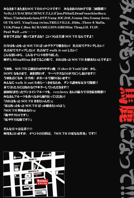 サウスしかかからないイベントを名古屋でしています!! 今回もわきらーしまくりですっ 今回は皆さんにわきらーダンスを伝授し、フロアー全員ワキラーを目指します。 チキヌルスーも同様だ!! とにかくアホになりたい方はオススメっ 今回もveryberryさんの協力を得、旬のフルーツのワンコイン販売をいたします。 みんなでフルーツ食ってワキラーすれば、楽しい事間違い無し!! また、レゲエもサウスの一環!!とも言えなくもないので、多分かけます! 来て後悔はさせませんよ!!!