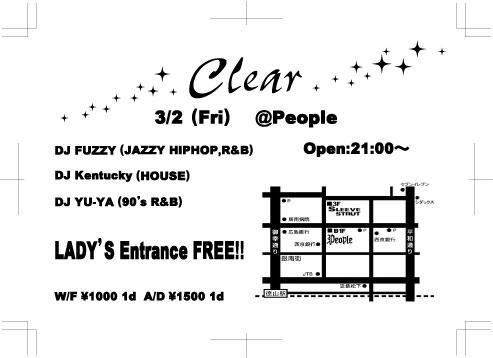 ★☆Clear☆★☆彡 @People 今回初めてイベントを開かせてもらうことになりました〜♪ このイベントはいい雰囲気作りに特に力を入れているので、普段のイベントでは飽きたとか、もっといい曲が聞きたいって思う人は要Check!! クラブ初心者の人でもどんどん来てください!! ジャンルもHIPHOP,R&B,HOUSEと幅広く誰でも楽しめますよ♪ 当日どんな感じの曲をかけるのかをSample音源でアップしたんで、視聴してみてください!! で、いいな〜って思ったら当日ぜひ来てください!! もっといい曲いっぱいかけますよ♪♪♪