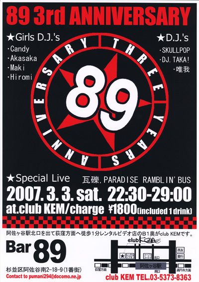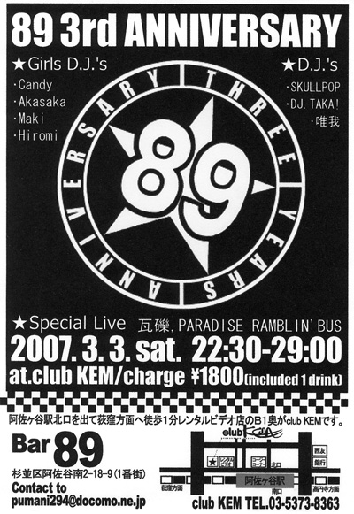 おかげさまで「89」も3周年を迎えました! 3月3日は3周年記念イベントです「3・3・3」ですv(^。^) 3月3日なので、女の子が主役です。 ひな祭りのイベントです(ホントか(^^;)) D.J.も女の子がメインです。 (あくまでも女の“子”です、はい(笑)) 今回は、お店のお客さんのバンドによるライブがあります。 店主ヒロミちゃんも歌うとのウワサ、お楽しみに! 2007年3月3日(土) 22:30〜29:00 場所は 阿佐ヶ谷駅前 club KEM チャージは 1800円 (1ドリンク付きです) ★Speciak Live 瓦礫(がれき) D.J.MA
