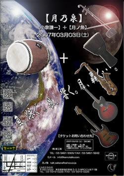 さぁてさて 今年最初の大一番がやってまいりました! 和太鼓奏者 小泉謙一との ツーマンライブですよ♪ ツーマンといっても 月ノ魚×小泉謙一ではなく 月ノ魚+小泉謙一なので 実質ワンマンライブです! なんということでしょう! 月ノ魚が ワンマンライブです! だいぶ気合い入ってます! この日のタメに作り上げた 『組曲・月乃泉』を筆頭に、 和太鼓とベースの リズム馬鹿セッションもあり、 さらにさらに! おーっとっと! あんまりネタをバラすと 楽しみが減ってしまうので、 是非とも会場に来て、 ソコで