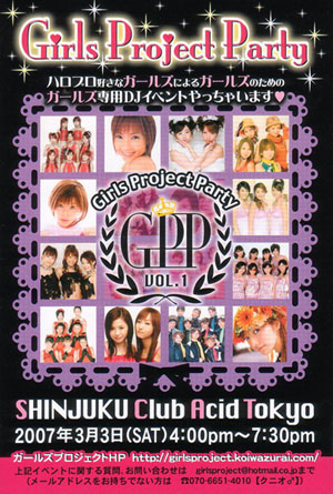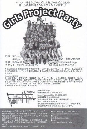 みなさん、初めまして☆ モーニング娘。高橋 愛ちゃん大好きの 現場必死系(?)のうみうし。と申します。 私は兼ねてより、女の子が現場に行ったっていいじゃん! 女の子だってハロプロファンでいいじゃん! ってことを、女の子の熱い思いを、 積極的に世に伝えられないか考えていました。 ここmixiで知り合った女の子のヲタ友達と ついに女の子専用のDJイベントを企画しましたので 宣伝させてください☆ *:;;;:*:;;;:*:;;;:*:;;;:*:;;;:*:;;;:*:;;;:*:;;;:*:;;;:*:;;;:*:;;;:*:;;;:*:;;;:*:;;;:*:;;;:*:;;;:* ★ Girls Project Party