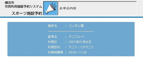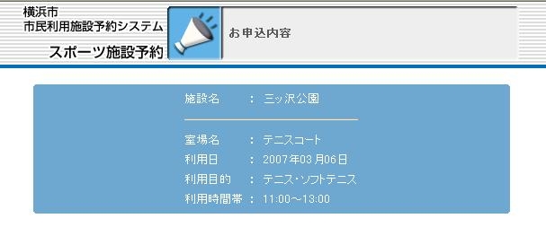 三ッ沢公園・テニスコート 2007/3/6 9:00〜13:00 料金:2200÷人数+NEW缶代(10円単位切り上げ端数分) ボールはわたしが用意します。 朝から4時間テニス 火曜日です。 またまた思い切って4時間分のコートを取りました。( ^ー^) ちょっと多めで4〜8人希望。 毎度のことですが。。。 キャンセル料が発生しないよう まずは3/1木曜の夜までの募集です( ^^)ノ!! アップしてダブルスのゲーム(ゲーム大会?)をしましょう。 人数が多い&けっこう寒い←こんなときは 運動量のある形式練習でもしましょう。 期