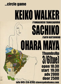 開場:18:30 開演:19:30 会場:横浜サムズ・アップ 出演:KEIKO WALKER &山口玉三郎 ),sachiko &佐藤克彦 ),オハラマヤ 料金:ADV¥2000/DOOR¥2500 場所:横浜市西区南幸2-1-22 相鉄ムービル3階 045-314-8705