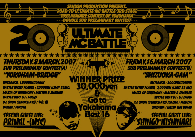SAKURA PRODUCTION presents ULTIMATE MC BATTLE 横浜準予選A 横浜大会 3月8日 木曜日 @CLUB THE BRIDGE YOKOHAMA 23:00 OPEN ENTRY MC'S: 2,000yen ENTRANCE:1,500yen/1drink ■司会 MASTER SharLee ■GUEST LIVE PRIMAL(MSC/Libra Record) ■BATTLE BEAT DJ DJ:Milky ■DJ SHUN(Temple ATS) 仲山 慶 DAISAC FURUYA http://www.libra-ltd.net/umb.html http://www.bridgeyokohama.com/artist/index.html