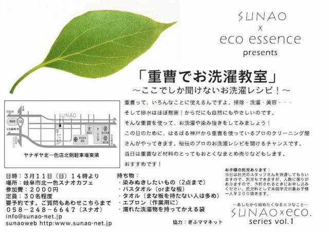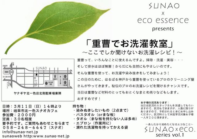 スナオ×エコエッセンス共催 重曹って、いろんなことに使えるんです。 掃除・洗濯・美容・・・ そして排水はほぼ無害!からだにも自然にもやさしいのです。 そんな重曹を使って、お洗濯をしてみましょう! この日のために、はるばる神戸から重曹を使っている プロのクリーニング屋さんがやってきます。 秘伝のプロのお洗濯レシピを聞けるチャンスです。 当日は重曹のとってもおとくなまとめ売りなどもします。 ぜひお越しください! 日時:3月11日(日)14時より 場所:岐阜市北一色スナオカフェ http://www.s