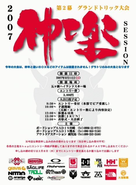大会告知です!!!!!!! 第二幕 グランドトリック大会 『神楽セッション』 開催日 3月11日 開催場所 五ヶ瀬ハイランドスキー場 エントリー費 3000円 大会予定 8:30エントリー 〔本部で受付ビブ渡し〕 10:00予選開始 〔天候&出場数により形式決定〕 12:00昼食&休憩 13:30決勝 〔2RUN〕 15:00表彰式〜大会終了! 大会コース 第一幕神楽セッション使用コース