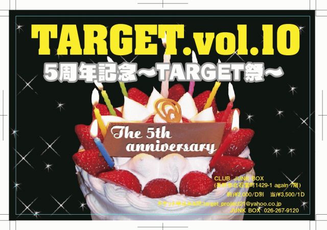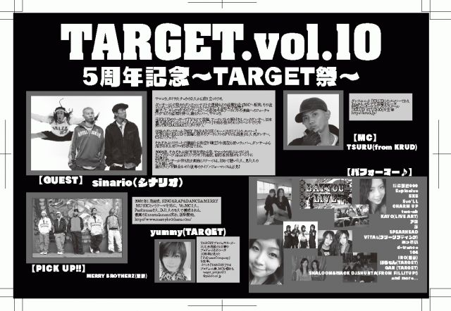 長野県ストリートダンス改革プロジェクト”TARGET”主催 【http://mixi.jp/view_community.pl?id=219144】 TARGET.vol.10 5周年記念〜TARGET祭〜♪ 2007年3月11日(日)open16時 CLUB JUNK BOX http://www.junkbox.co.jp/nagano/index.html (長野市北石堂町1429-1 again7階) 前売り:¥2,000/ドリンク別 当 日:¥3,500/1D 第10回目となる【TARGET】〜まつり〜♪ おかげさまで、TARGETプロジェクト5周年を迎えました。 祭というだけに みんなでさわいじゃお〜よ♪♪♪ 今回の出演は、 ダンスチーム