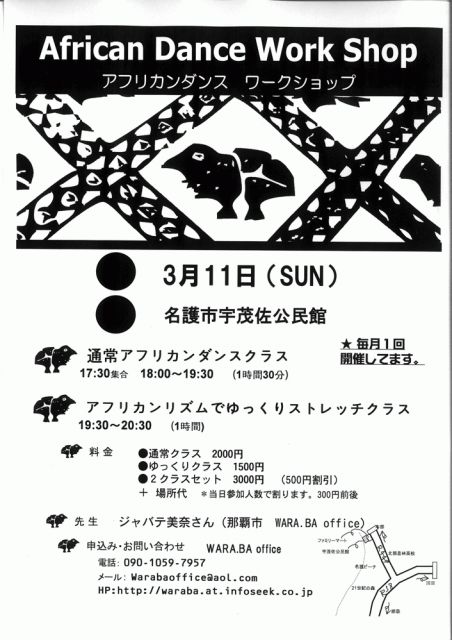 【NAGO】 African Dance Workshop [→http://uruma.ap.teacup.com/waraba/268.html] ★毎月1回開催しています!★ 3/11 (sun) @名護市宇茂佐公民館 (許田インターから58号線を本部方面に左にそれて、左に来るファミリーマートの角を左の突き当たり) ●通常アフリカンダンスクラス 17:30 集合 18:00〜19:30(1時間30分) ●アフリカンリズムでゆっくりストレッチクラス 19:30〜20:30(1時間) ☆料金☆ ・通常クラス ¥2,000 ・ゆっくりクラス ¥1,500 ・2クラスセット ¥3,000 +場所代