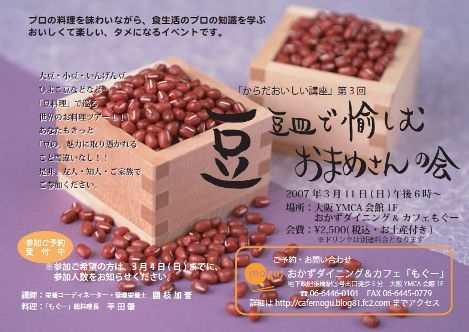 みなさまこんばんは、管理人まめってぃです。 ちょっとしたイベントの告知をさせて頂きます。 MOGUの「からだにおいしい講座」第3回 『豆皿で愉しむおまめさんの会』 http://cafemogu.blog81.fc2.com/blog-entry-10.html 2007 年3 月11 日( 日) 午後6 時〜(要予約) 講義担当 : 管理栄養士・栄養コーディネーター 國枝 加誉 (くにえだ かよ) 料理担当 :「もぐー」総料理長 平田 肇 (ひらた はじめ) 大豆・小豆・いんげん豆・ひよこ豆などなど… 「豆料理」で巡る世界のお料理ツアー!!