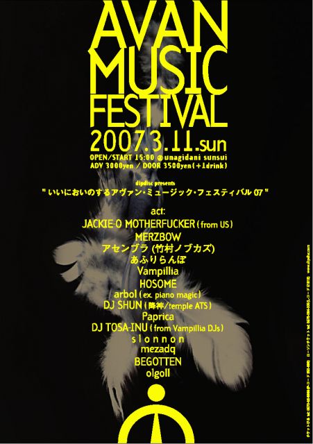 「いいにおいのするアヴァン・ミュージック・フェスティバル 07」 3月11日(日) @unagidani sunsui 鰻谷燦粋 open/starat 15:00 adv. 3000yen door.3500yen (+1drink) act: JACKIE-O MOTHER FUCKER (from US) MERZBOW アセンブラ (竹村ノブカズ) あふりらんぽ Vampillia HOSOME arbol (ex. piano magic) DJ SHUN (降神/temple ATS) etc... ※当日先着100名様に出演者の未発表曲を集めたスペシャルなCDをプレゼント ※再入場可 チケットぴあ(P-コード 250-696 ) ローソンチケット(L-コード 51612 ) htt
