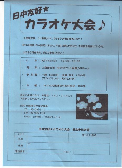 NPO大阪府日中友好協会・青年部主催のカラオケ大会です。詳細は写真をご覧下さい。