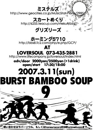 burst bamboo soup9 2007.3.11(日) ミステルズ(十三) スカートめくり(大阪) グリズリーズ(神戸) モンド・ダイヤモンド(高松) ホーミング5710(和歌山) THE FOOTSTEPS(和歌山) DJ:ぽんず open/start 17:30/18:00 adv/door 2000/2500+1drink 会場:loversoul JR和歌山駅より西進10分 http://www.lifecompany.jp/loversoul/access.html (和歌山市北の新地2丁目33 北の新地ビル4階 073-435-2881)