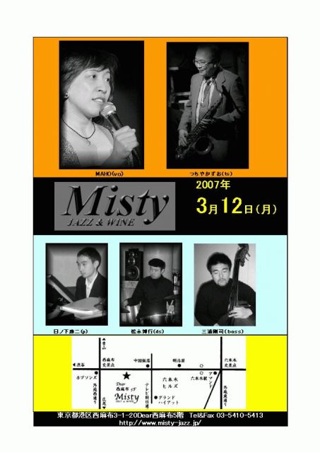 つちやかずお(Ts)リーダーのカルテット+Voのライブです。 チャージは1セットごとですので、1セットだけでも損はないです。 ♪2007年3月12日(月) 西麻布 Misty http://www.misty-jazz.jp/index.html 東京都港区西麻布3-1-20Dear西麻布5階 Tel&Fax 03-5410-5413 1st 8:00〜8:40pm / 2st 9:20〜10:00pm / 3st 10:40〜11:20pm (各セットごとのMチャージ、1セット1,000円) つちやかずお(Ts) 三浦剛司(b) 日ノ下慶二(p) 松永博行(ds) MAHO(Vo)